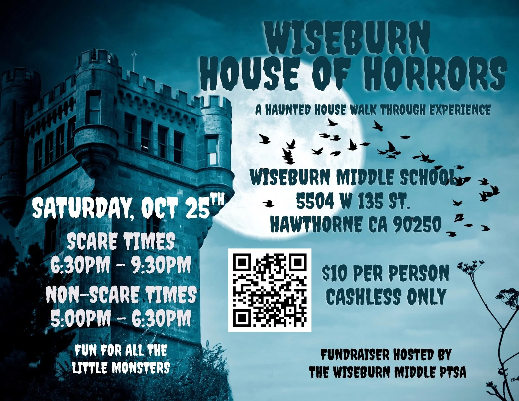 This year, our Haunted House is so big and spooky it deserves an additional night! Join us on Saturday, October 25th at Wiseburn Middle School for a special Haunted House walk-through filled with thrills, chills, and surprises.