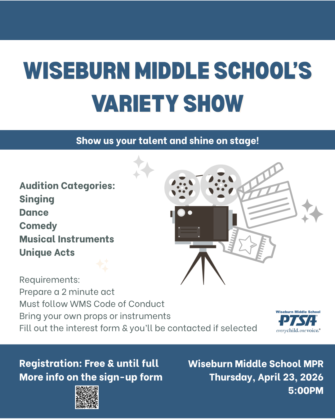 The first WMS Variety Show is coming and we're so excited to see our Dolphins shine! Individual and group acts are welcome and will only have two (2) minutes to perform, sign-up now!